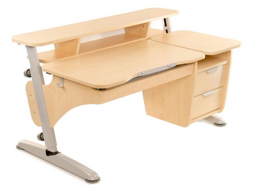 Оказывает негативное влияние на осанку школьника. Во время занятий препятствует нормальному освещению. Угловой стол может быть как с ящиками, так и с полками.