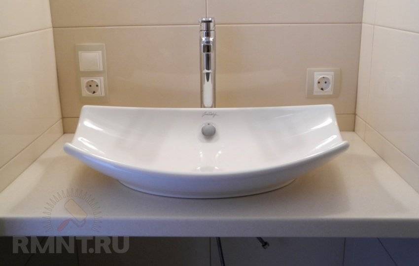 Накладная раковина (встроенная сверху) вставляется в специальное отверстие, сделанное в столешнице. При этом углубляется лишь нижняя часть мойки, а верхняя опирается на столешницу. Визуально кажется, что раковина стоит на столешнице. Такой вариант больше подходит для ванных комнат.