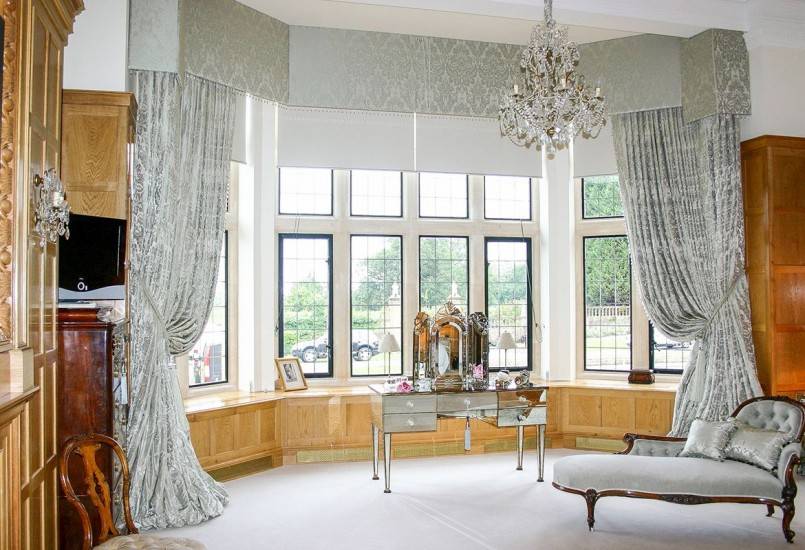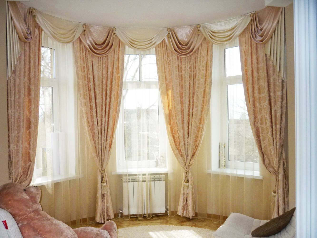 Такая архитектурная схема оформлена с выступами. В эркере предусмотрено несколько окон, расположенных между собой под углом. Для драпирования применяются уширенные складки, массивные занавески, многослойные конструкции.