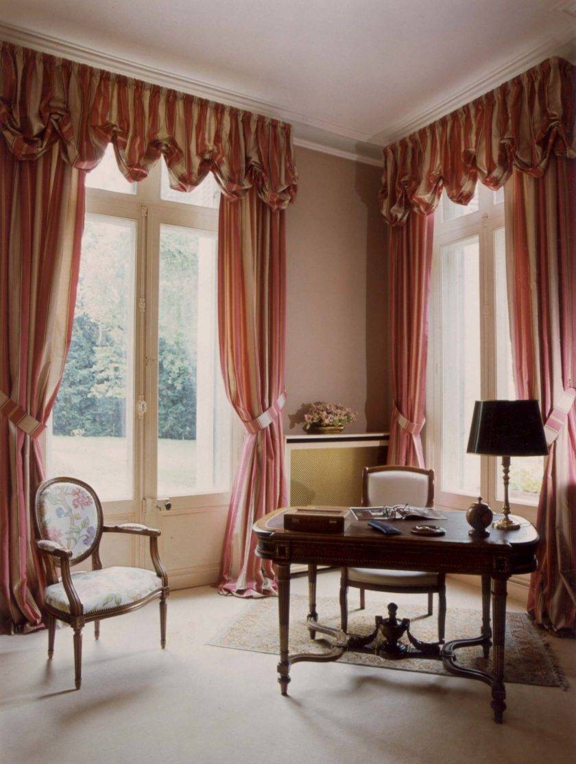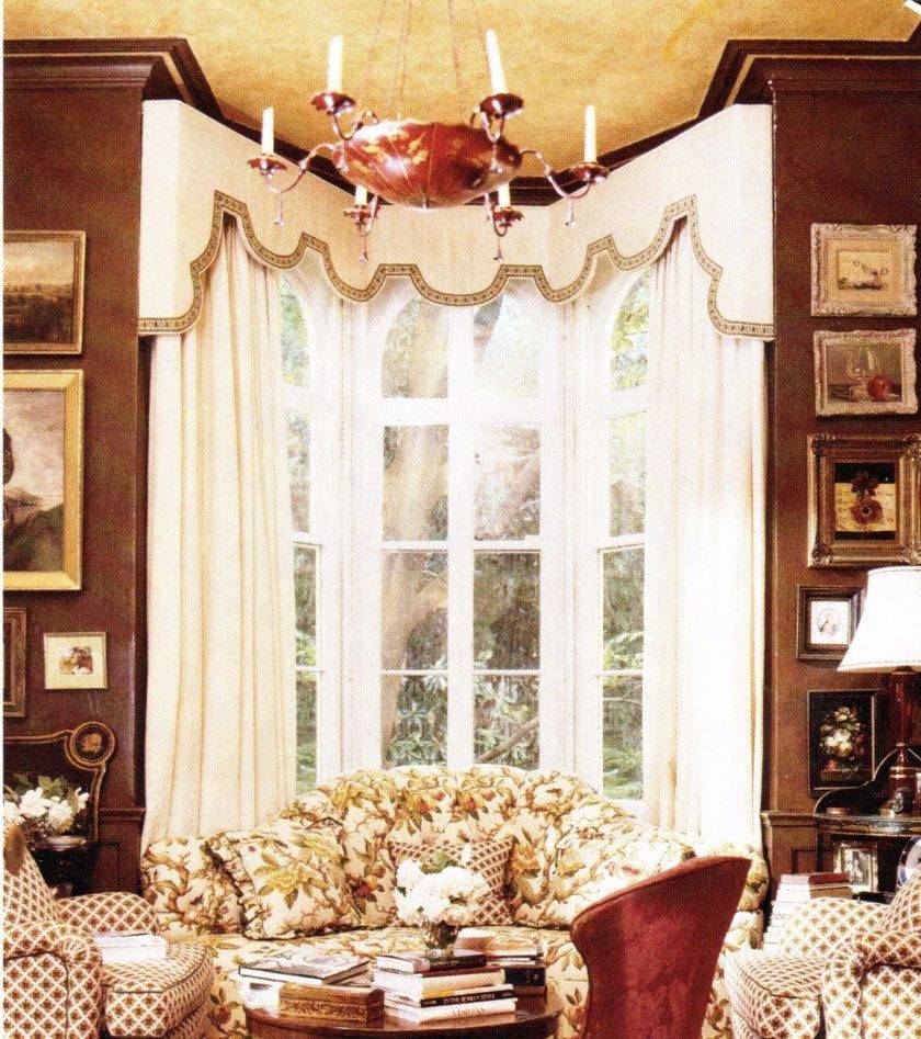 Угловое окно в зале оформляется симметрично, т.к. будут задействованы две стены. Дополнит оконную композицию кокилье или галстук в углу, на стыке двух стен.