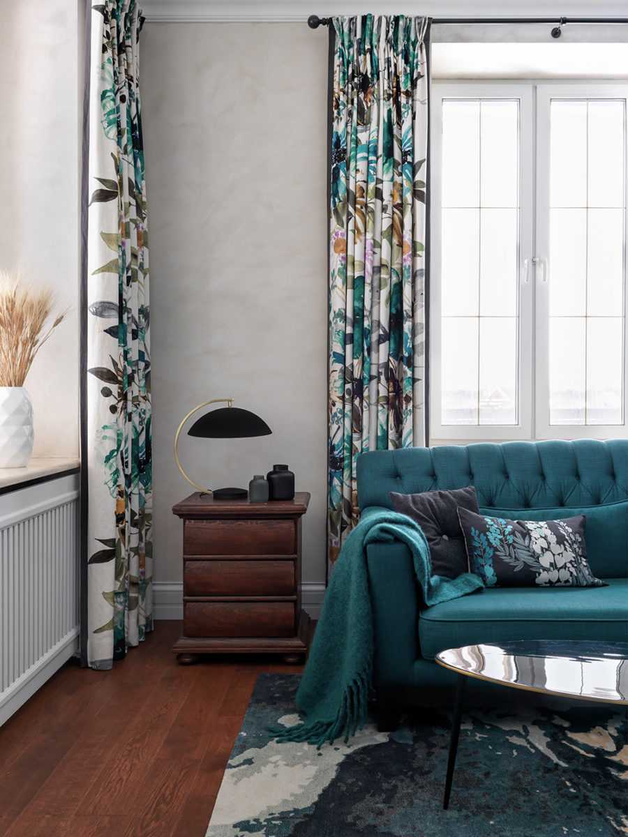 Цветочный рисунок нужно выбирать осторожно: слишком крупные и броские детали могут перегружать пространство. Такую ткань рекомендуется сочетать с однотонной, чтобы добиться гармонии