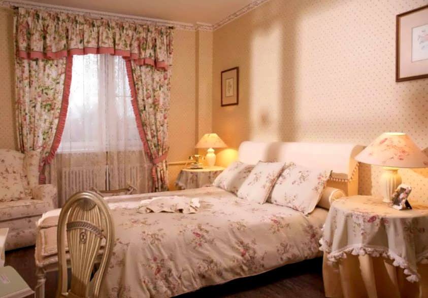 Кроме этого, если на обоях есть рисунок, узор, к тому же очень интенсивный, то в такую спальню лучше выбирать однотонные шторы, в тон к одному из цветов обоев. Если же обои имеют скромный, ненавязчивый, едва заметный узор, то шторы также можно выбирать с подходящим по теме и цвету рисунком или узором.