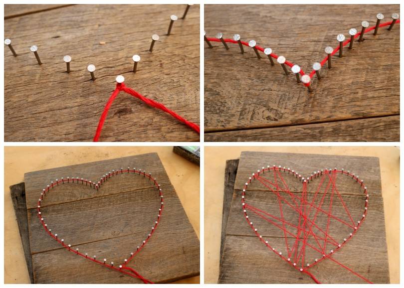 Когда гвоздики уже набиты по определенному контуру и периметру доски, существует два варианта заполнения. В первом заполняется внутренняя часть, во втором – фон. Есть и третий вариант, когда середина оформляется нитками одного колера, края – другими. Ниточки не обязательно пересекаются во множестве мест. Например, если контур квадратный (круглый), а середина в виде сердечка (кружочка), линии проходят в разные стороны рядом, как лучи от солнца. Использование нескольких цветов нити, расположенных «внахлест», позволяет создать красивые оттенки. Для создания легкого, ажурного рисунка используются тонкие швейные нитки, шерстяная пряжа – для более объемных работ.