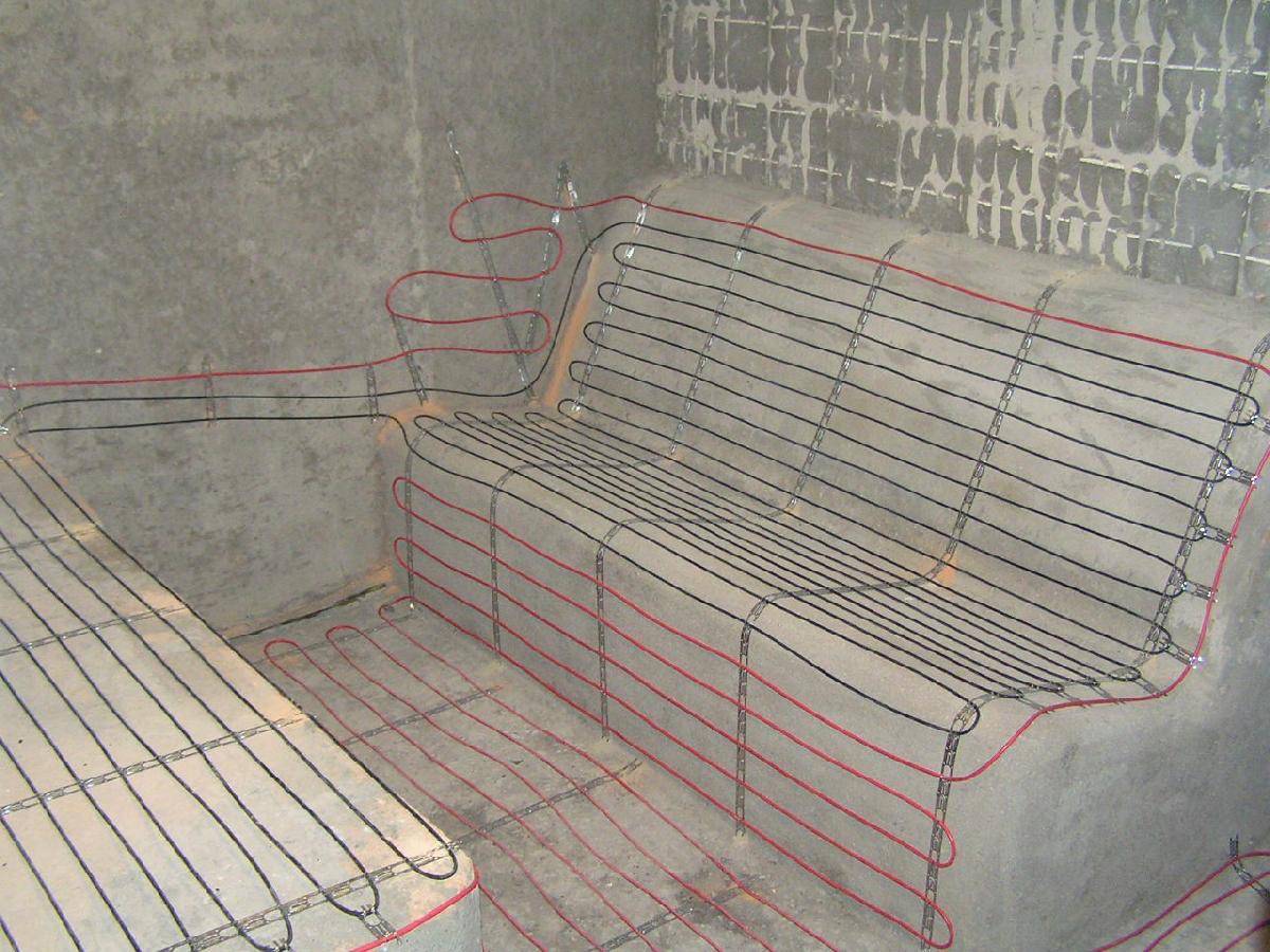 Электрический подогрев осуществляется с помощью кабелей, уложенных в стенах, потолке, лежаках. Система оснащается терморегулятором, позволяющим устанавливать требуемую температуру. Это более экономичный способ устройства подогрева поверхностей, чем водяной. Но более затратный в процессе эксплуатации помещения за счёт высоких тарифов на электроэнергию. Однако выгоден тем, что не требует технического обслуживания.