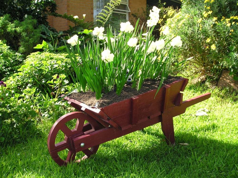 Сейчас продаются разные телеги: железные, деревянные, пластмассовые. Если хотите современный ландшафтный дизайн: купите белую. Для более аутентичных садоводов есть идея: взять настоящую деревенскую телегу, покрасить или покрыть лаком, отшкурить, привести в порядок.