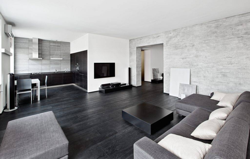 А вот способность пола темных цветов сохранять свой оттенок независимо от обстановки и возможность стильно оформить квартиру дизайнеры причисляют к его неоспоримым достоинствам.