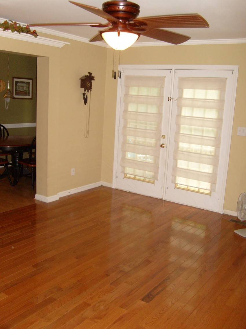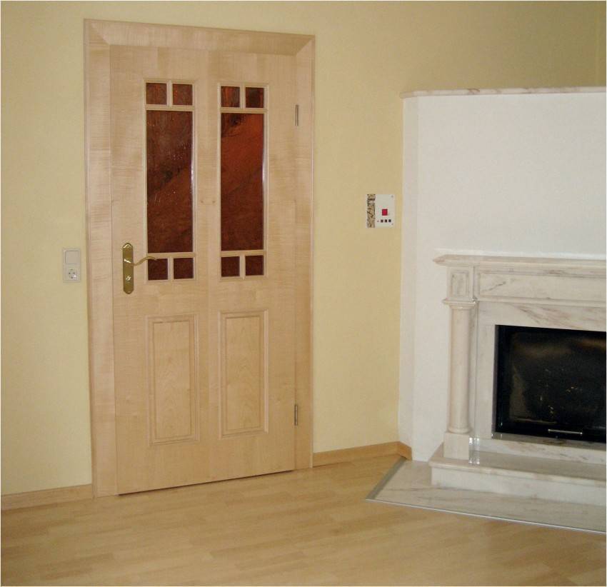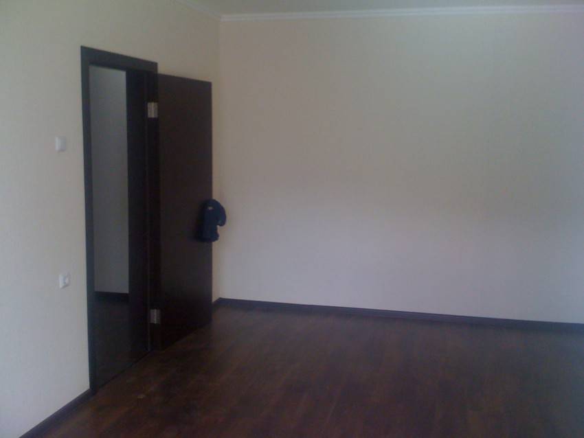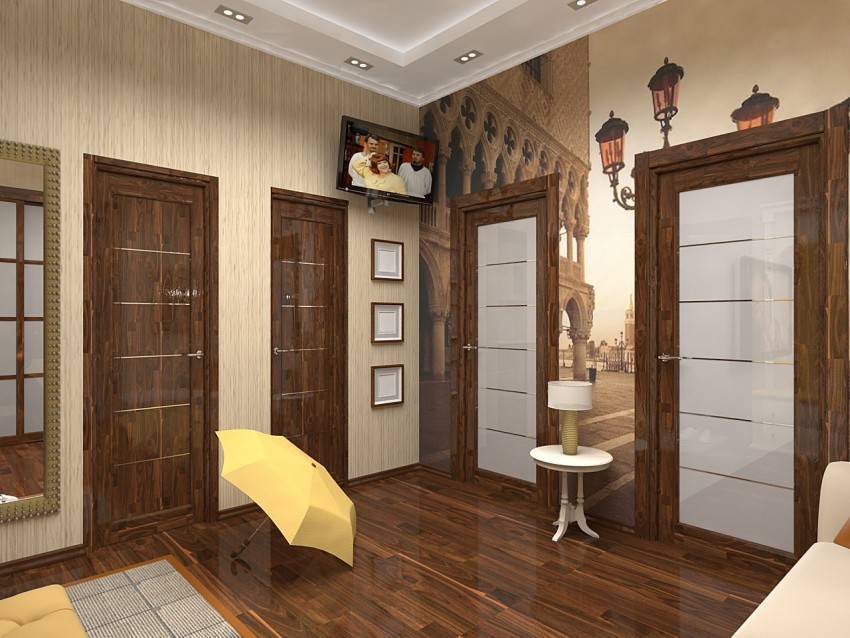 На фото зал и бежевые межкомнатные двери в сочетании с линолеумом темно-коричневого оттенка.