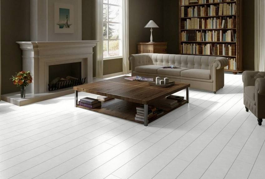 Белый ламинат в интерьере гостиной будет смотреться эффектно и зрительно сделает зал больше. Узор и текстура дерева на полу, отделка стен сдержанного цвета и предметы мебели плавных форм будут лаконично сочетаться в классическом интерьере, образуя единую картину.