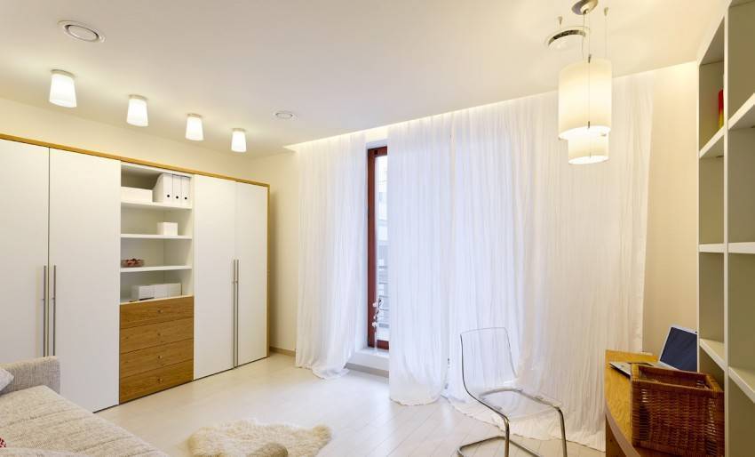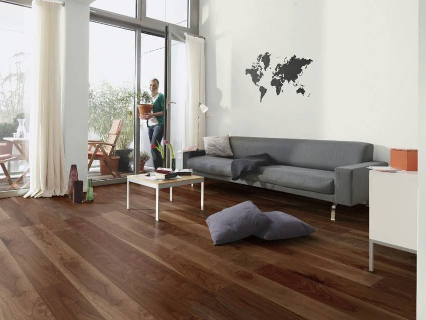 В гостиной и спальне в качестве покрытия подойдет ламинат, паркет или ковролин. Дизайн гостиной со светлым полом отличается аккуратным видом, а темная мебель выглядит изящнее.