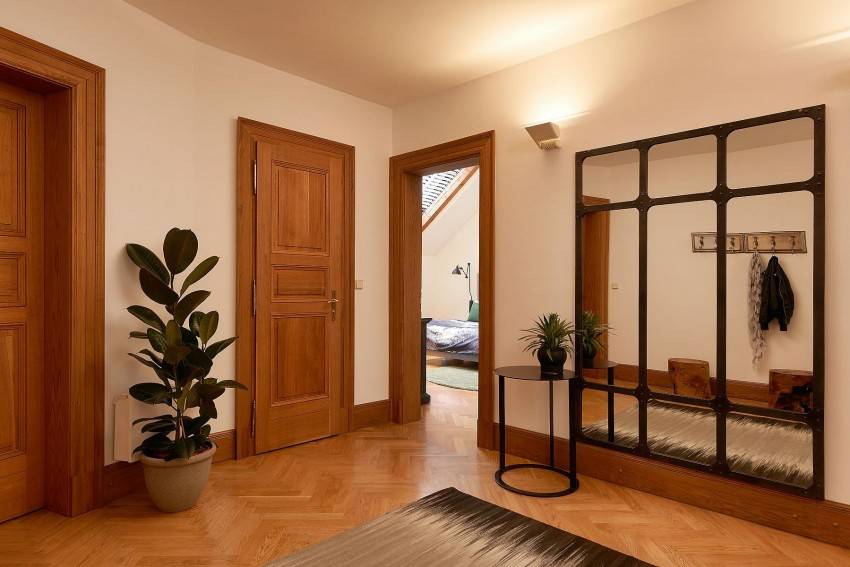 Такой цветовой контраст всегда выглядит по-особенному роскошно и делает интерьер шикарным и респектабельным. Темное покрытие пола вызывает ощущение прочности и надежности, а светлые дверные конструкции добавляют в данную композицию свободы и простора.