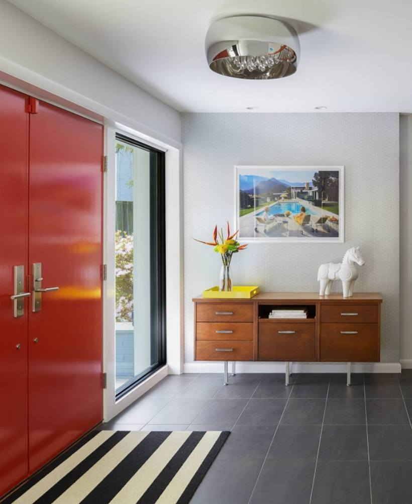 На фото сочетание черного дверного полотна со светлым полом в прихожей.