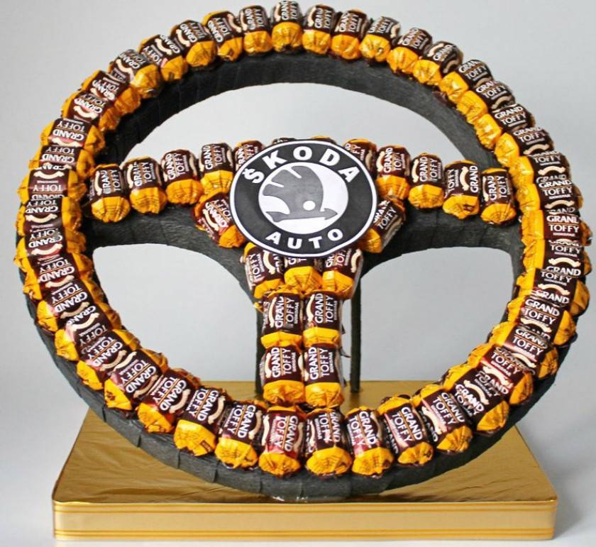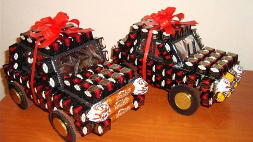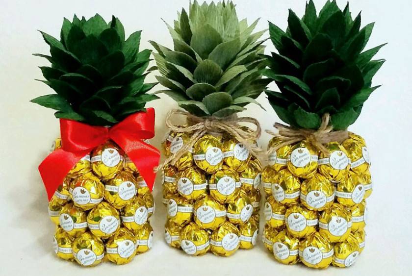 Из сладостей также делают поделки из конфет для мужчин, которые тоже могут быть сладкоежками. Мужские подарки представлены в виде бутылки шампанского, похожей на ананас, машины или гитары. Никто не запрещает проявлять креатив – подарок от этого будет только слаще.