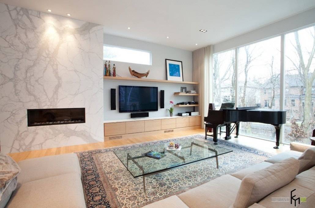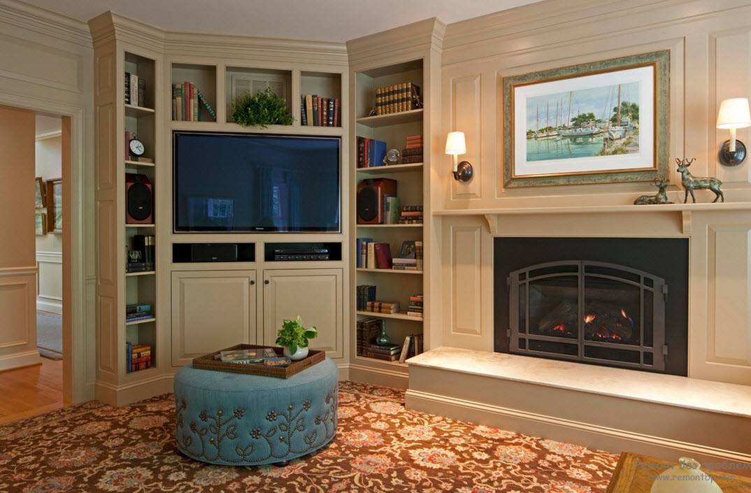 При расположении данных предметов важно учитывать, не только интерьерное решение гостиной, но и ее площадь и планировку. Также желательно, чтобы очаг и тв-устройство были примерно одинакового размера, в противном случае один из элементов будет притягивать на себя больше внимания и выбиваться из общей композиции