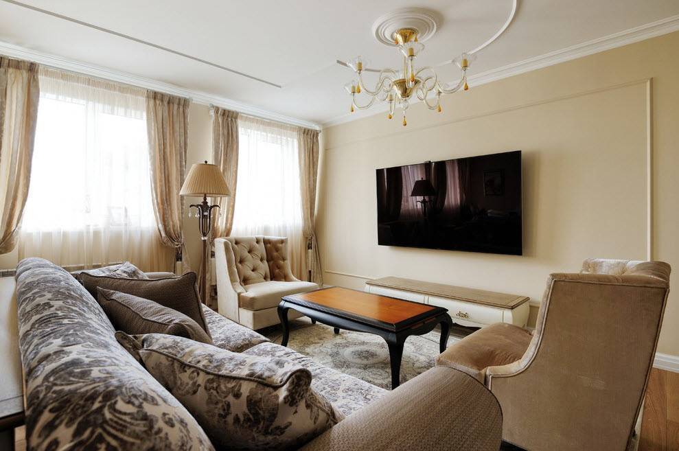Соединение дорогого и утонченного антуража комнаты и современных технологий, очень сложная дизайнерская задача. Плазменную панель в таком виде интерьера можно спрятать в специальный шкаф, но не всем нравится такое решение. Отличным вариантом в таком случае становится оформление экрана как картины, которая расположена по центру комнаты. Для обрамления монитора используют специальную лепнину, фактурно напоминающую рамку настоящей картины, полотном же служит экран плазмы. Стиль комнаты тогда не нарушен. Все правила оформления выдержаны и телевизор смотрится очень привлекательно и гармонично. Примером дизайна стены в классическом стиле с телевизором в гостиной, показано, на расположенном ниже фото.