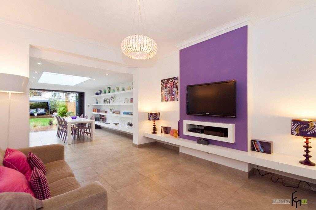 Неординарный и смелый стиль, который удачно сочетает как современные, так и классические элементы. Стена с телевизором может быть оформлена в светлых или, наоборот, ярких красках, на контрасте с отделкой пола, потолка и других стен.