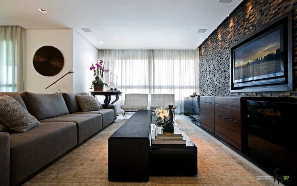 Профессиональные дизайнеры предлагают массу вариантов грамотного обустройства гостиной с телевизором. Бюджетным решением могут стать красивые стильные фотообои или же обои, отличающиеся цветом или фактурой от основных стен. Более дорогое оформление – декоративная каменная или кирпичная облицовка, деревянные или 3d-панели.