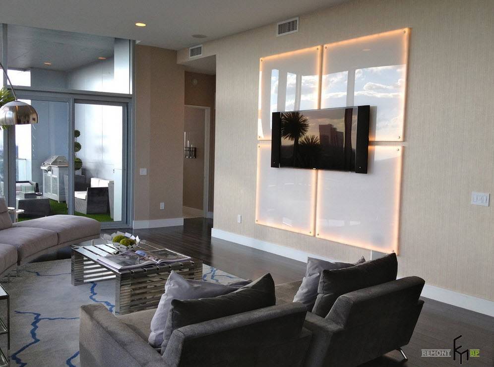 Телевизор часто является одним из главных элементов интерьера, поэтому фон и декоративная отделка стены должны гармонично сочетаться с монитором. Популярным направлением является монтаж ниш из гипсокартона. С его помощью можно реализовать самые смелые дизайнерские идеи, сделать гостиную стильной и оригинальной. Можно оформить нишу натуральным деревом. Важную роль играет материал и цвет отделки стены. Для декорирования используют зеркальную плитку, фотообои с коллажами, искусственные панели, декоративный камень и кирпич.