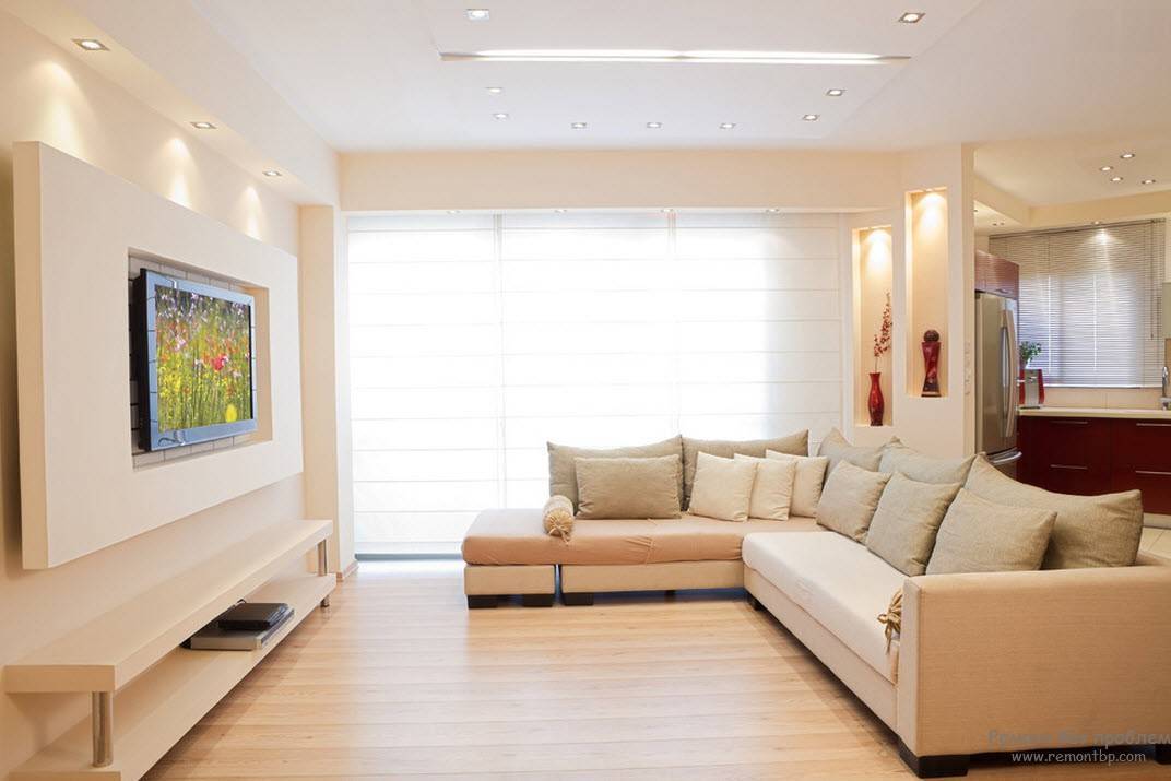 Чаще всего телевизор располагают в зоне отдыха гостиной. Как гармонично вписать его в общий интерьер? На этом остановимся более детально.