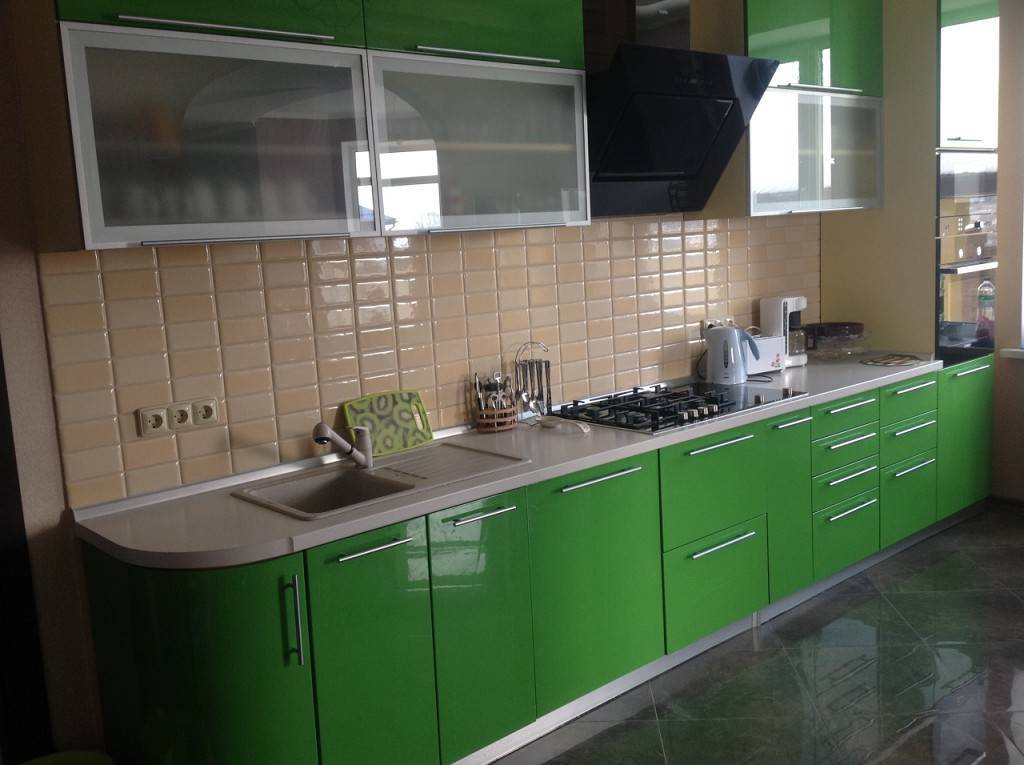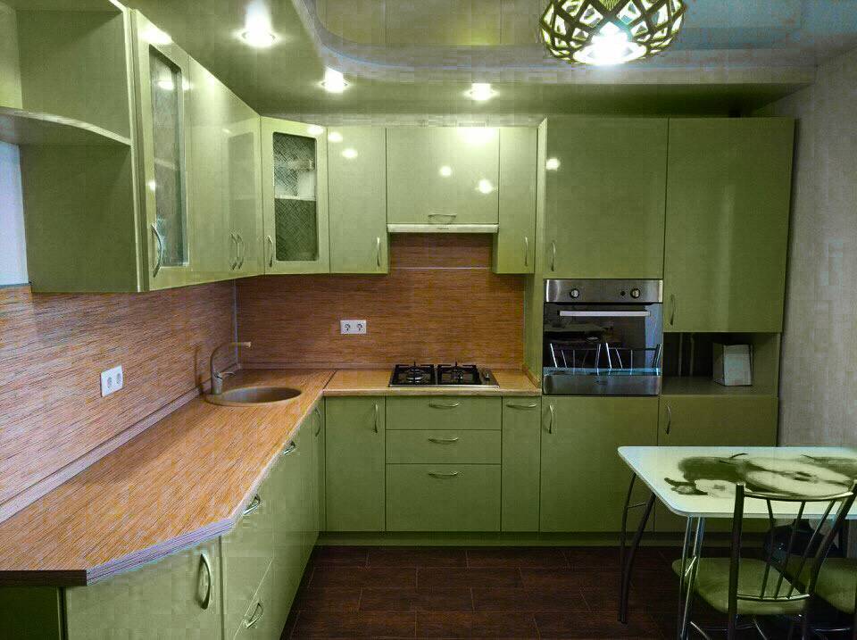 Современные интерьеры вполне могут быть представлены всеми оттенками зеленого. А несколькими годами ранее подобное колористическое решение можно было встретить только в ретро-направлениях. Глубокий изумрудный или малахитовый оттенки вполне успешно сочетаются с темным, даже черным полом. Кухонная мебель в таких тонах не будет выглядеть угрюмо, потому что структура этого оттенка «играет» на свету.