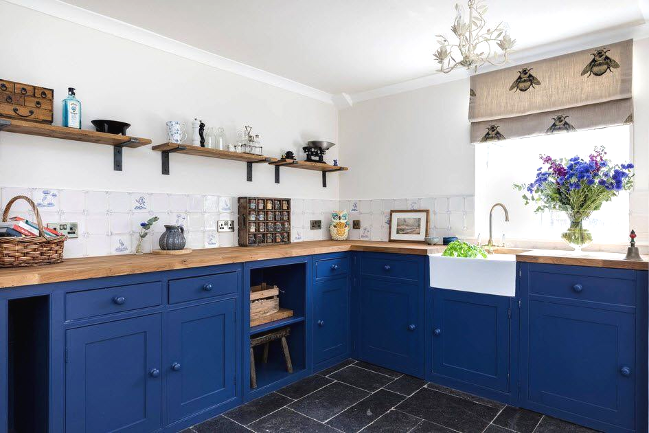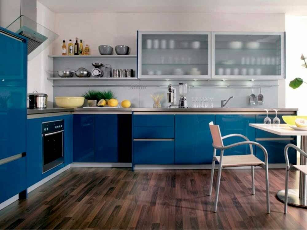Синее цветовое решение для кухни выбирается довольно редко. Но подобное решение абсолютно неоправданно. Ведь глубокий оттенок моря и бури вполне уместно сочетать с темным покрытием пола. Только в этом случае будет уместным наличие дополнительного звучания нежной отделки. Например, темно-синяя мебель должна быть оснащена светлыми поверхностями. В такой интерьер отлично впишутся светильники белого или серебристого цвета.