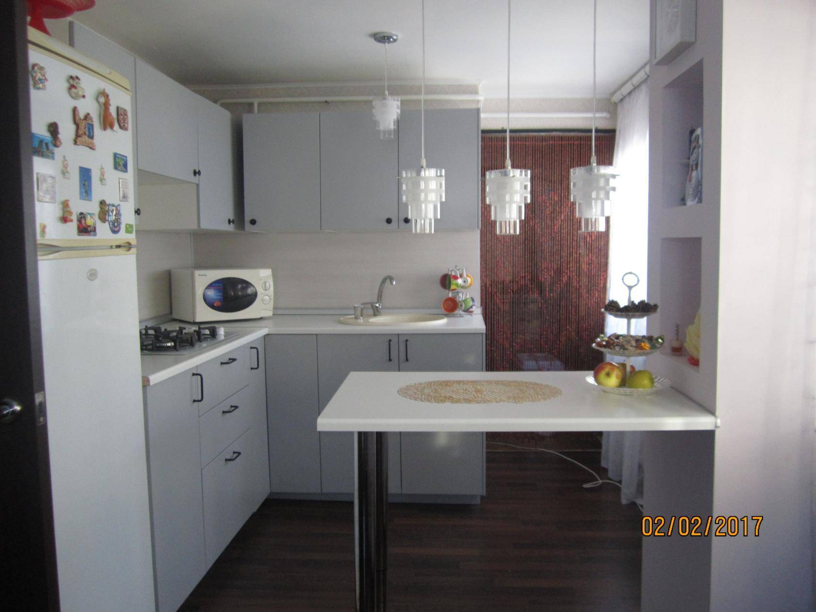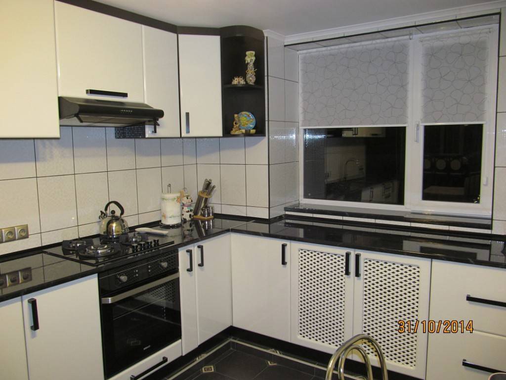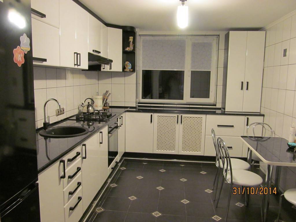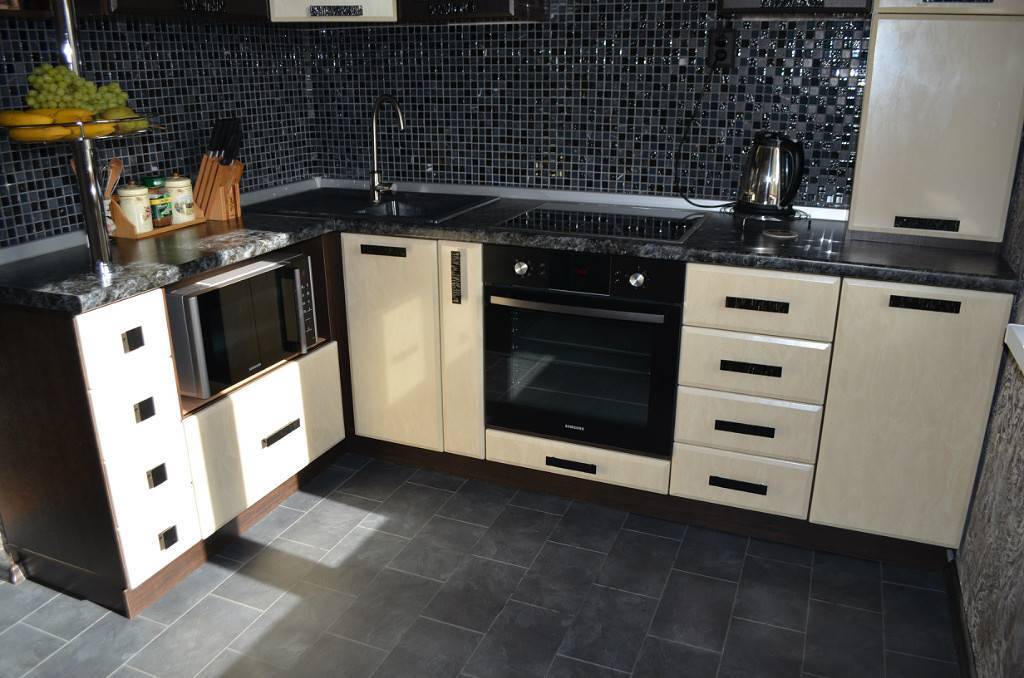 Подходит серый или коричневый линолеум, плитка под дерево или квадратный кафель с чередованием цветов. Под белый гарнитур подойдет черная плитка, с матовым гарнитуром сочетается глянцевый кафель.