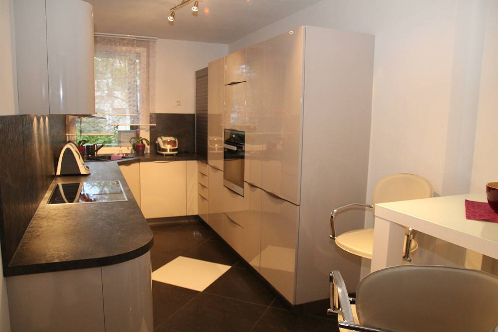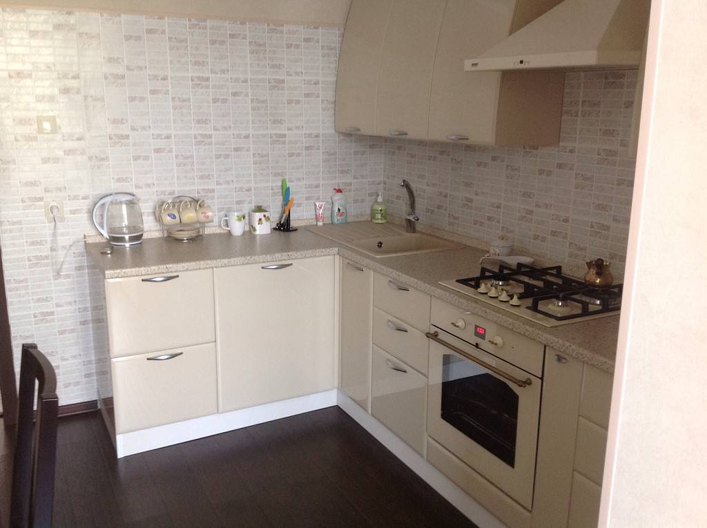 Бежевый цвет также принято считать классикой. Он многогранен и подходит для обустройства интерьера любого помещения. Этот тон для оформления кухни может выступать в качестве основного, идеально дополняясь глубоким переходом темного напольного покрытия.