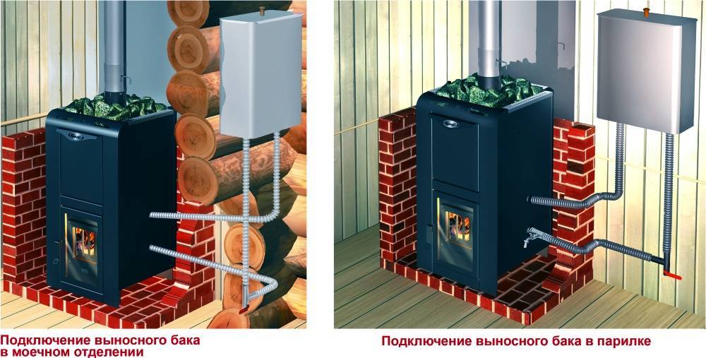 - Выносной бак для воды следует подбирать в соответствии с мощностью банной печи — слишком большая емкость будет долго нагреваться. В маленьком баке вода рано закипит и заполнит моечную ненужным паром.