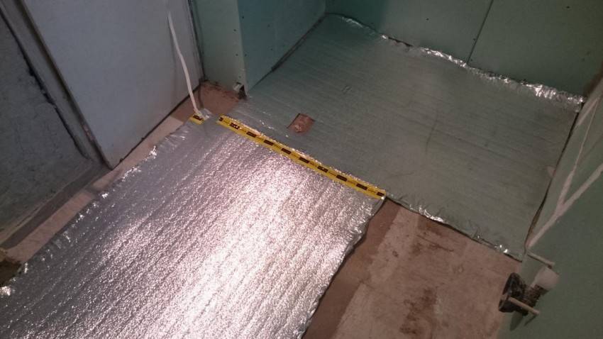 В первую очередь выкладывается гидрослой, а затем теплоизоляционного материала. Задача последнего – это утеплить помещение, уменьшить его теплопотери. Поверх него следует уложить теплый пол, который нужно залить стяжкой или тонким слоем плиточного клея