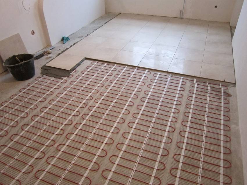 Возможность смонтировать электрический теплый пол без стяжки под плитку обеспечивают вышеупомянутые греющие маты. Они представляют собой модульные конструкции, уже готовые для проведения монтажных работ – это небольшие участки из прочной сетки, на которых закреплены отрезки греющего кабеля. Раскатываем на ровной поверхности, наносим клей, укладываем плитку, даем высохнуть – теперь все готово, можно смело ходить по ней и ставить мебель.