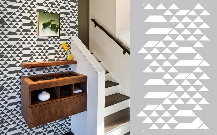 Гео-трафарет ниже от Storenvy может быть использован для создания паттерна на всю стену (как показано ниже, слева), но лучше создать гео-границу для акцентирования внимания на окрашенную стену (внизу, справа).