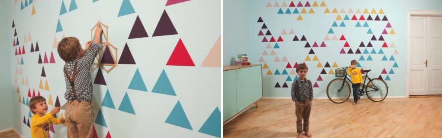 Если вы поклонник вариаций и смелых заявлений, то расписные стены созданы именно для вас! Вместо того чтобы создавать шаблон, который предсказуем, попробуйте сделать яркий дизайн с использованием трафаретов. Гео-стена ниже, была создана с помощью обойной мозаики от ZNAK, но вы можете сотворить версию с ручной росписью с помощью самодельных треугольных заготовок.