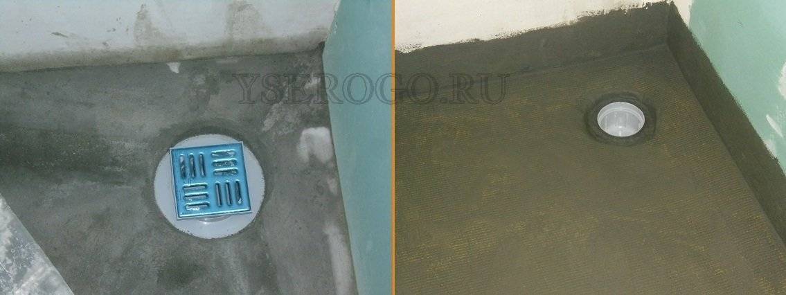 После высыхания стяжки необходимо выполнить гидроизоляцию пола. Поверх бетона сначала для этих целей укладывается мембрана. В ней предварительно делается отверстие для трапа. Поверх мембраны промазывается битумно-полимерная мастика. Обрабатывается не только пол, но и стыки стен, углы и нижняя часть стены (примерно на 15 см). Слой мастики -3 см.