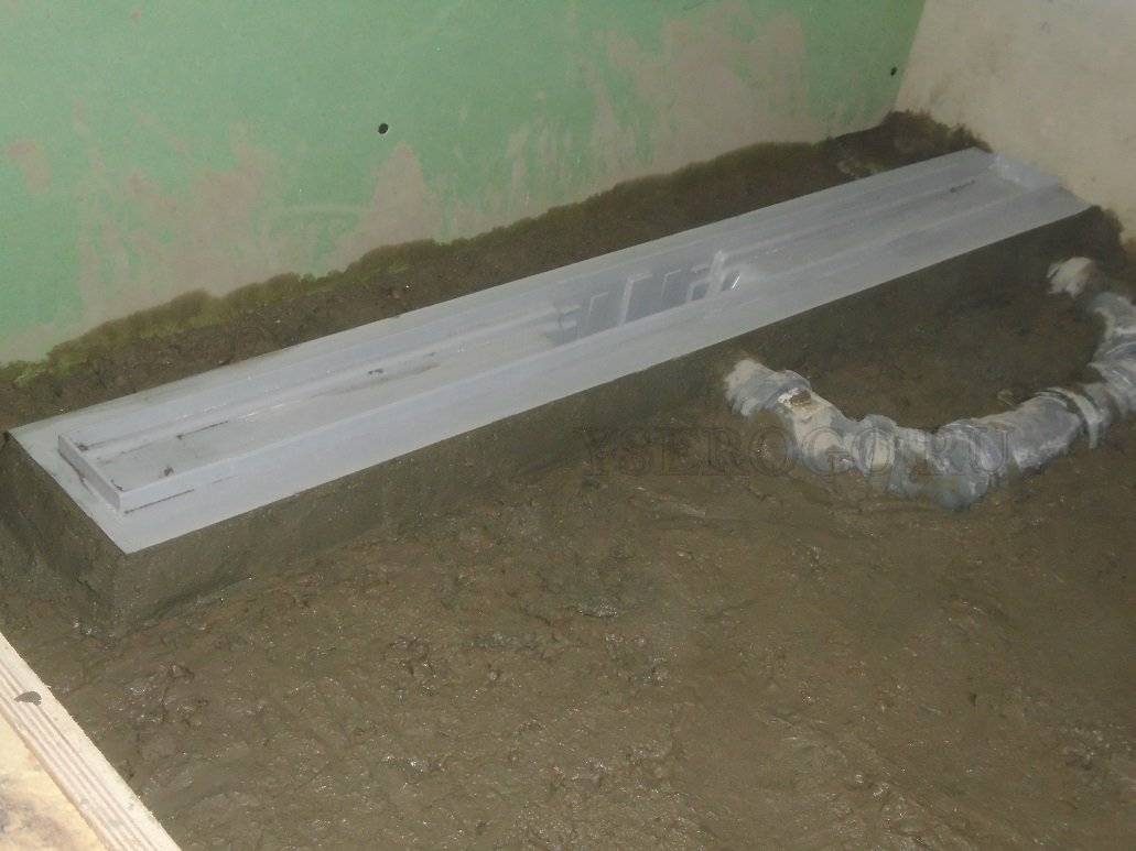 Теперь в намеченном месте монтируем т рап или лоток. Для этого необходимо сначала смонтировать трап и его опоры строго по инструкции. Все коммуникации (сифон, трап, трубы) соединить между собой в одну конструкцию и протестировать отвод воды путем заливания жидкости в трап. После того как система отвода воды смонтирована, решетку трапа лучше заклеить самоклеящейся пленкой во избежание попадания в нее строительной грязи и мусора.