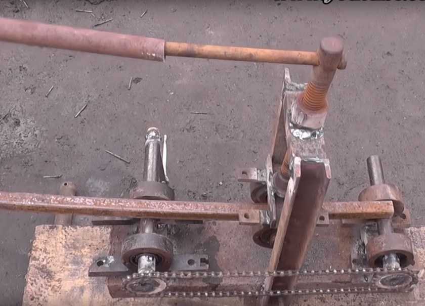 Самодельный трубогиб для профильной трубы на основе проката подразумевает, что заготовка будет уложена на боковые ролики, а сверху прижата третьим. После фиксации трубы в этом положении останется только привести посредством цепной передачи в движение валы для достижения нужного изгиба.