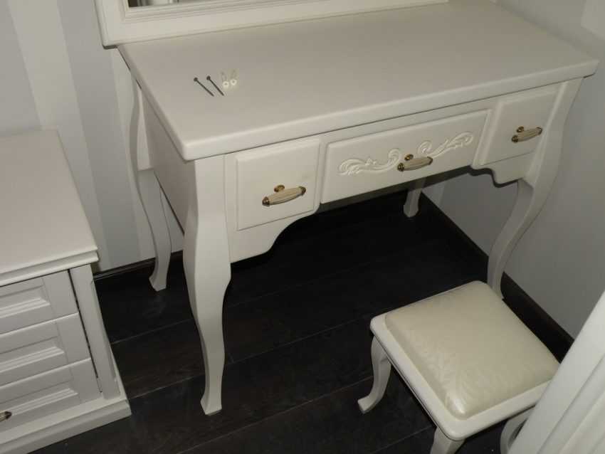 Классический туалетный столик – представляет собой обычный стол с четырьмя ножками, приставленный к стене, на которой располагается зеркало. Может иметь выдвижной ящик.