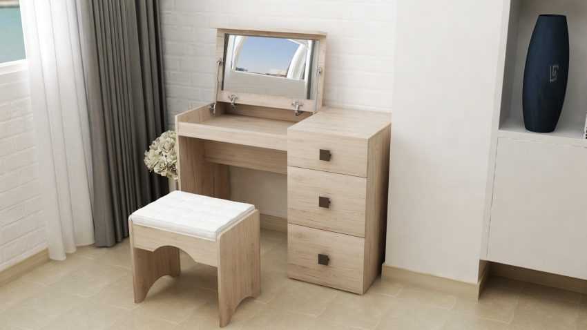 - Лучше всего выбирать модели с небольшим и изящным пуфиком в комплекте. Это позволит комфортно расположиться перед зеркалом и при необходимости задвинуть пуфик под стол, освободив тем самым пространство.