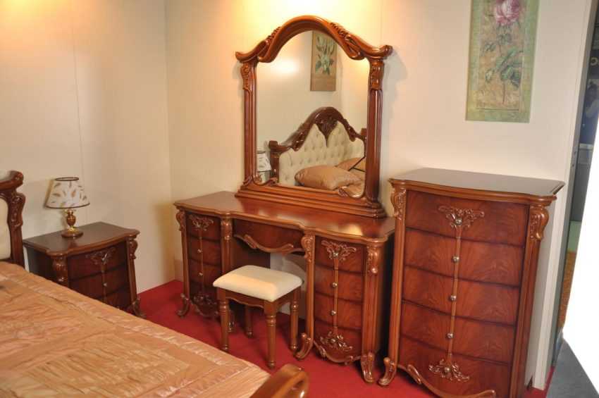 Если спальня выполнена в классическом стиле, то наилучшим дополнением будет столик, украшенный изысканной резьбой по дереву. Само зеркало в интерьере спальни в классическом стиле должно иметь круглую или овальную форму, быть обрамлено роскошной хромированной или серебряной рамкой.