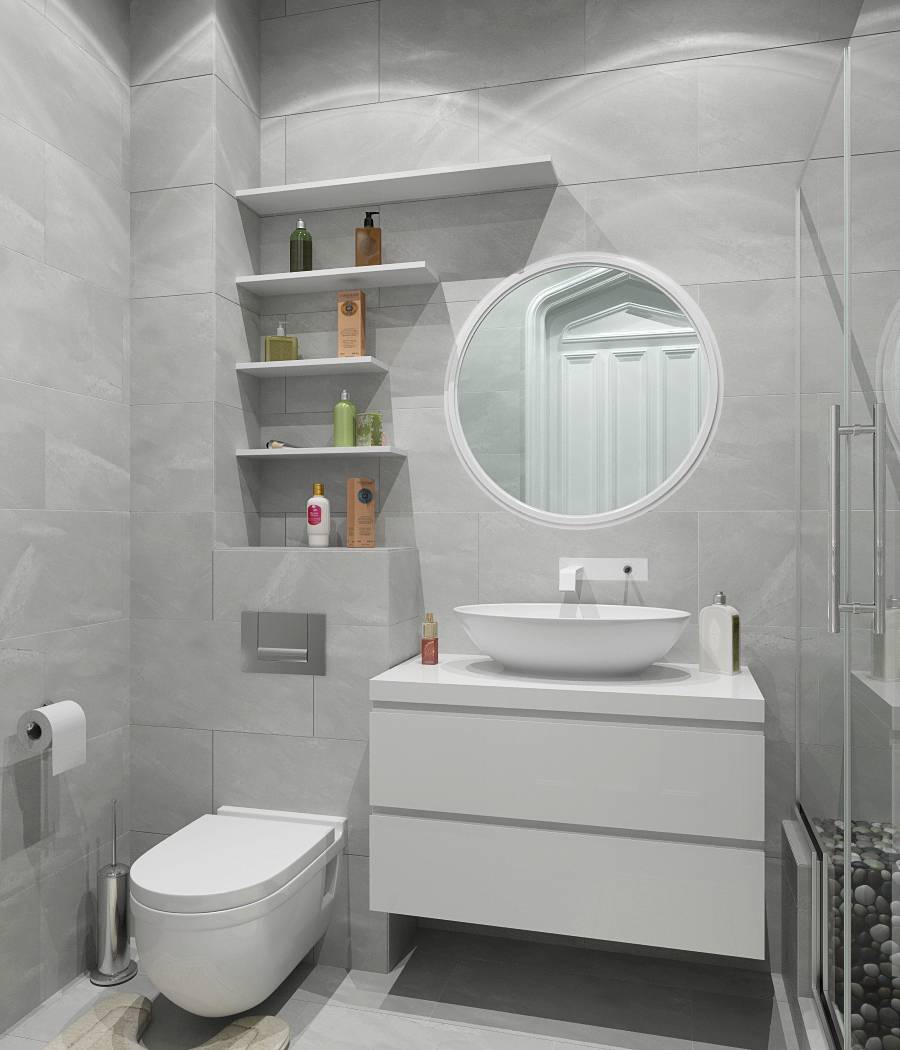 Современный дизайн создается с помощью эргономичной сантехники подвесного типа, спокойной цветовой гаммы (белой, серой, бежевой и т. д.). Такой интерьер отличается своей функциональностью, в нем полностью отсутствуют (или присутствуют в минимальном количестве) декоративные элементы и аксессуары.