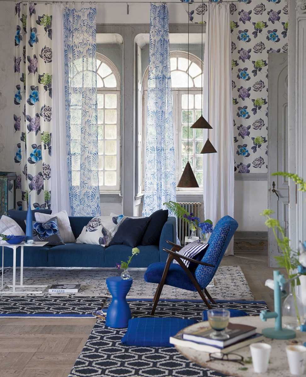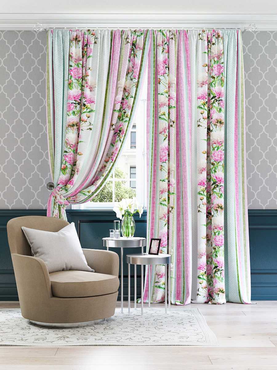 - сочетающиеся материалы с одинаковым рисунком, но разной плотностью, например, тонкая вуаль для тюля и более толстые ткани для штор, но оба варианта с тем самым принтом.