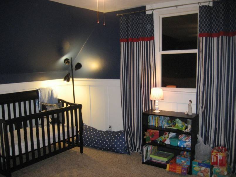 Если ваш малыш любит книжки и игры про пиратов, морские путешествия, то комнату можно оформить в морском стиле, используя синие, голубые, белые и бирюзовые цвета, в том числе шторы можно выполнить в виде облаков, морских волн с различным рисуночным принтом этой тематики. Классический вариант, который порадует любого мальчишку — фотошторы с машинками, самолетами и любимыми зверями.
