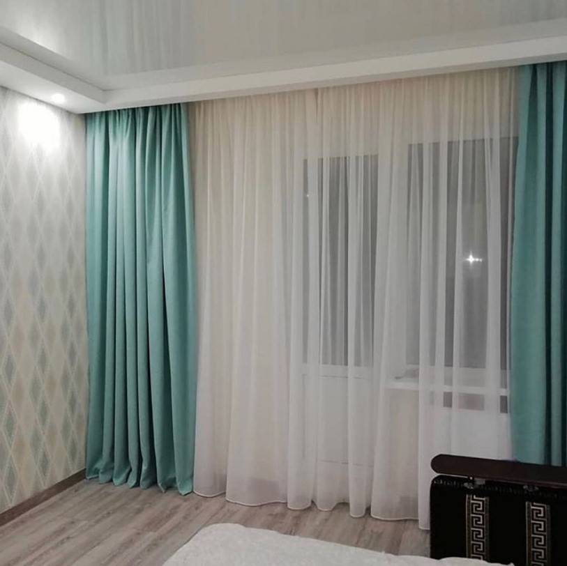 - С портьерами. Этот вариант подходит для разных стилей. Изделия бывают однотонными и разноцветными. При этой комбинации узор должен присутствовать на одном предмете. Не стоит выбирать портьеры из натурального материала и тюль из органзы.