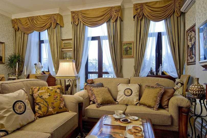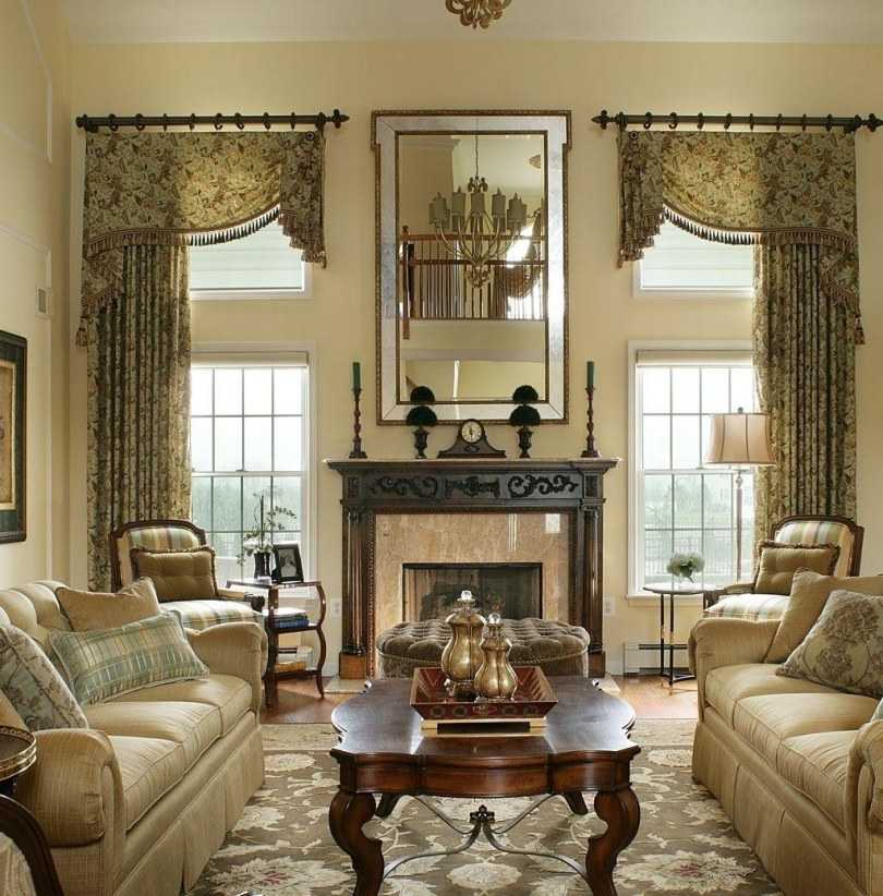 Гостиная в классическом стиле требует строгого оформления в сдержанной гамме. Тюлевые гардины и теневые шторы должны образовать единый ансамбль. Сегодня актуальны спокойные сочетания кремового с шоколадным, светло-зеленого с оливковым, серебристо-белого с маренго.