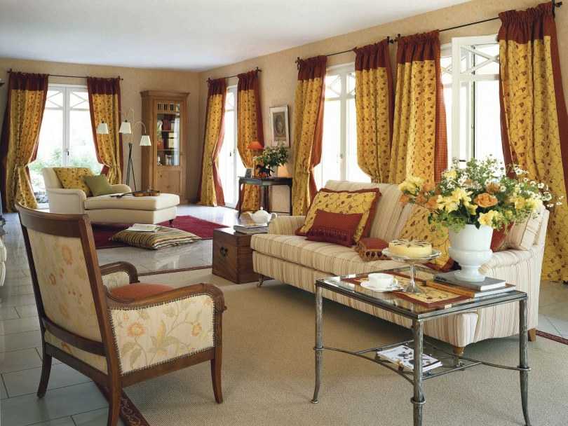 Общее правило оформления гостиной гласит: чем пышнее и заметнее декорированы окна, тем более простой должна быть мебель. Современные идеи в журналах по дизайну предлагают не экономить на материале: сегодня актуальны длинные многослойные шторы, позволяющие менять интерьер по настроению.