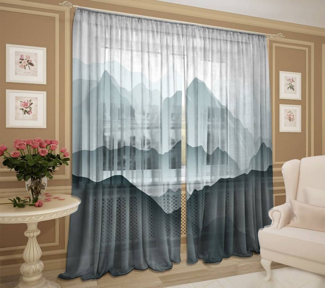Дизайн тюля может быть представлен жатой тканью. В плане разновидностей внешнего оформления занавесок стоит выделить нанесение печатного рисунка. Он может быть выполнен в приглушенной палитре или же в виде 3D эффекта, благодаря чему такие варианты удастся использовать в залах и гостиных, оформленных в современном стиле.