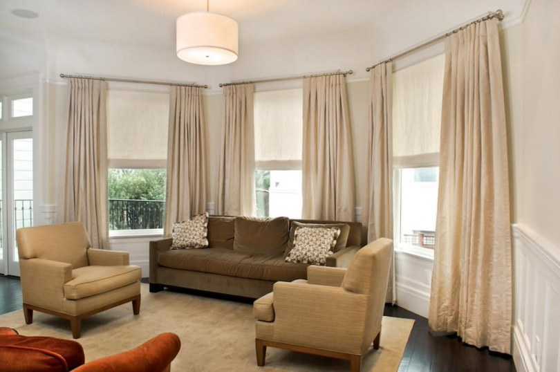 Желательно, чтобы это были натуральные тканевые материалы. Например, плотный лен для римских штор и хлопковый сетчатый тюль для гардин, или сочетание занавесок из плотного и прозрачного шелка.