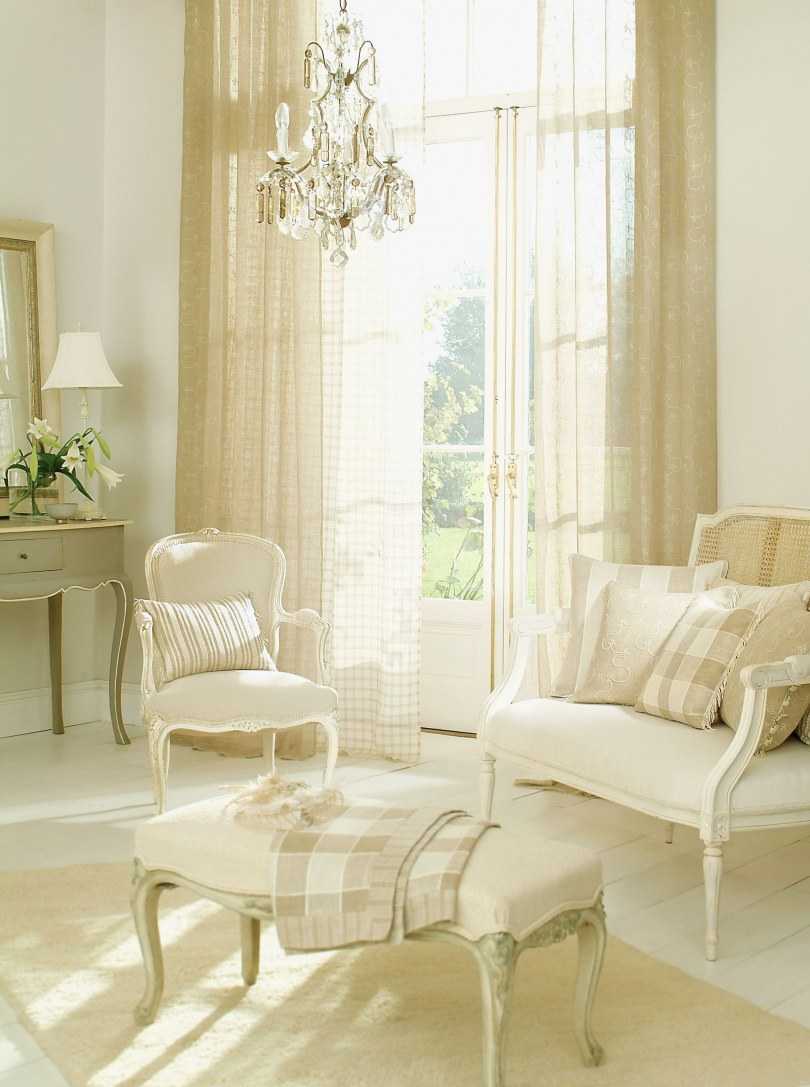 Предложения дизайнеров полны разных идей на тему тюля в гостиной: от классических вариантов из полупрозрачной однотонной вуали до современных модных образцов из драпированной сетки на ленточных люверсах. В основном многие отдают предпочтение однотонному длинному тюлю из органзы, шифона или вуали. Его можно использовать в разных интерьерах и самостоятельно добавлять аксессуары. Достаточно купить одну из этих тканей, прошить её по низу, вставить тесьму – и традиционная занавеска готова. Для оригинальности ей можно сделать складки-банты или добавить кольца из шелковой ленты и золотой шнурок для обвязки.
