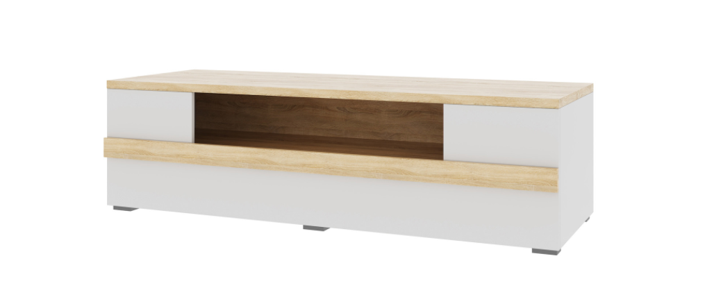 Центральной деталью большинства современных интерьеров является телевизор, установку которого лучше всего производить на специально предназначенную для этой цели тумбу ТВ. Оптимальным вариантом для этого вполне может стать модель из коллекции Куба, представленная в сочетании белого глянцевого и уютного древесного оттенков. Тумба под ТВ имеет широкую столешницу, которая станет надежной опорой для телевизора с любыми габаритами. Для размещения дополнительной аудио и видео техники можно использовать просторную внутреннюю полку. Тумба выполнена из ЛДСП, обладающей такими преимуществами, как практичность и красота.