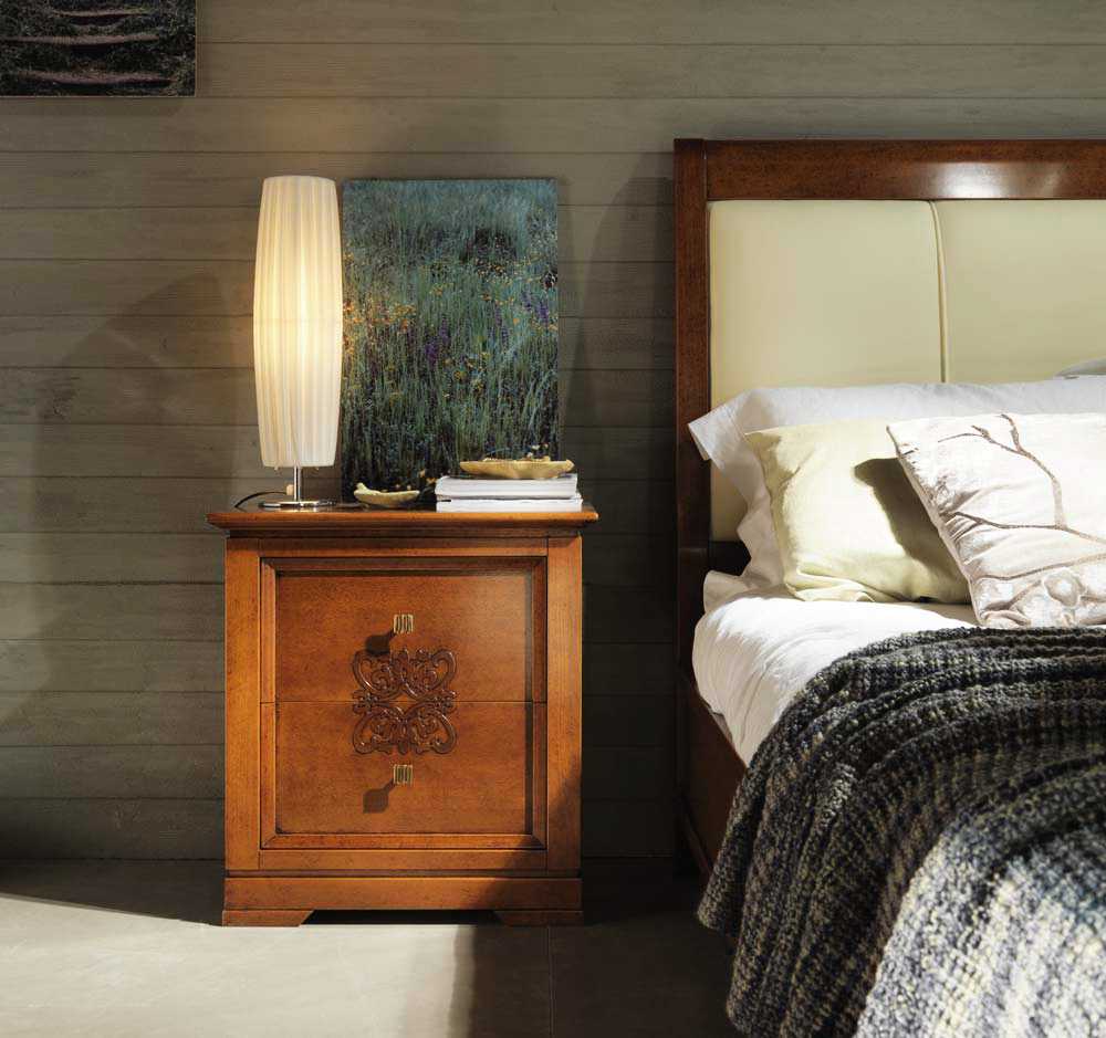Тумбы или столики являются акцентами, привлекающими внимание. Например, для спальни из массива отлично подойдет кованая прикроватная тумбочка.