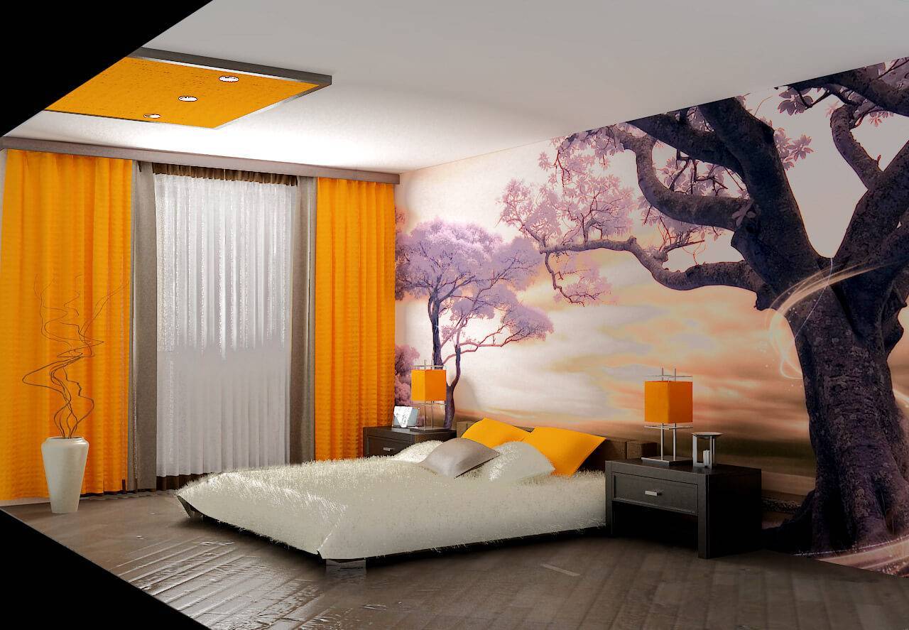 Гигантское дерево, напечатанное на фотообоях, «унесёт» хозяина спальни в дальние просторы и создаст ощущение полного единения с природой. Яркие жёлтые акценты придадут спальне настроения и красок.