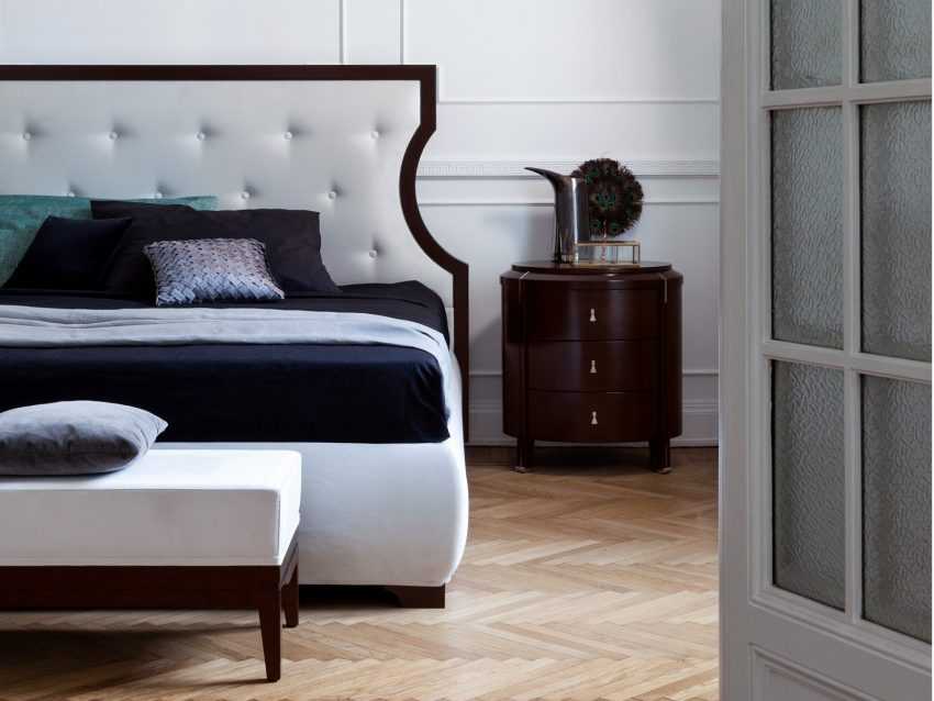 Еще одним вариантом покрытия считается мягкая обивка. Каркас прикроватной тумбочки зашивают настоящей либо винилискожей, тканевыми материалами с наполнением. Кутаная тумбочка полноценно исключает получение травм при случайных ударе об мебель.